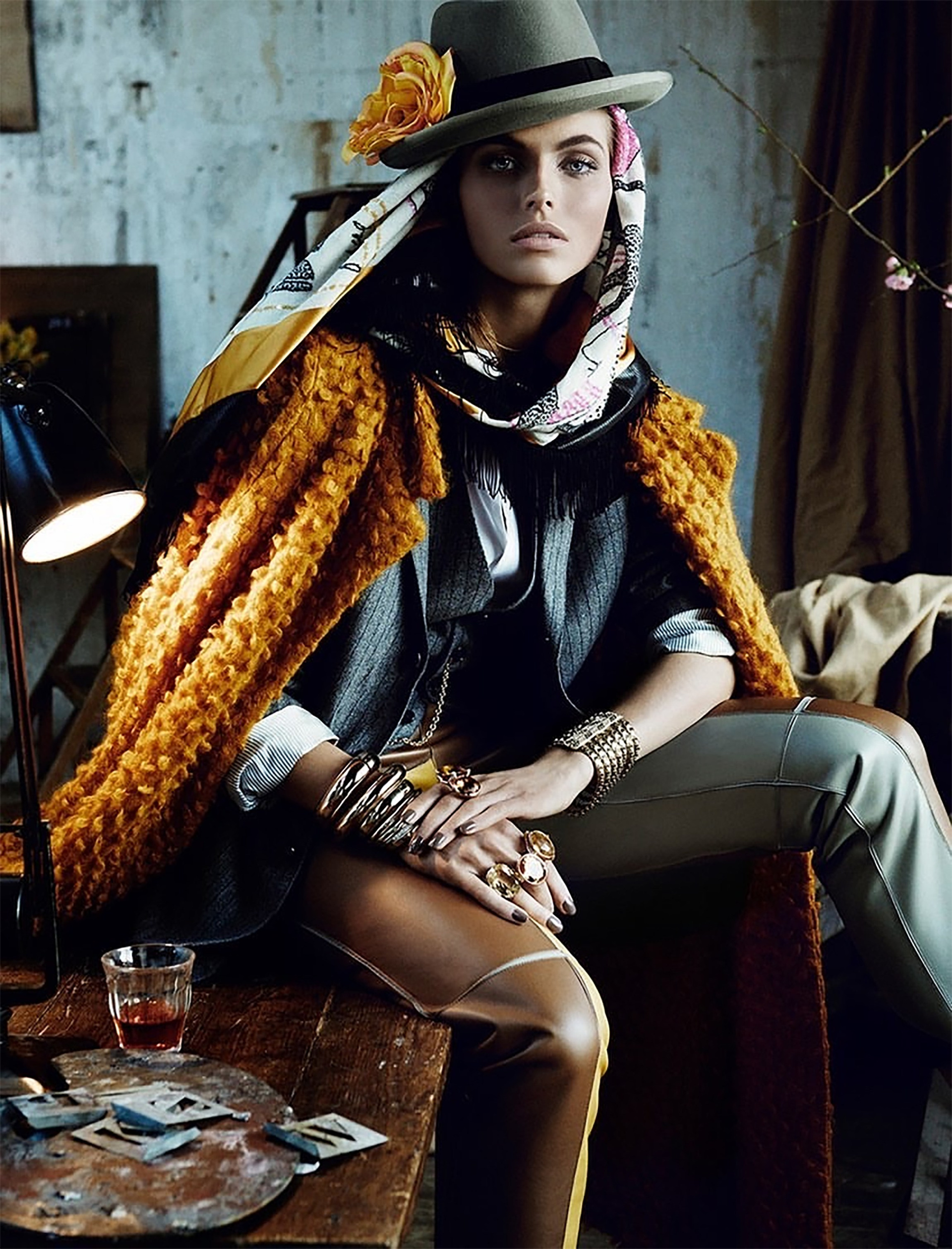 Одежда и стилистическое решение: В данном кадре превосходно выполнено стилистическое решение и создан образ. Цветовое решение подчеркивает образ. Крупные украшения подчеркивают руки и идеально вписаны в образ. Стилисту 5 звезд из 5 прекрасно. Из атрибутов что-то добавить в кадр, думаю тут же появится мысль что лишнее в кадре. Лично для меня к такому стильному образу напрашивается сменить стакан, поставить хрустальный может с кусочками льда. С другой стороны простота в данном месте кадра не отвлекает от образа, что для фотографии главное.